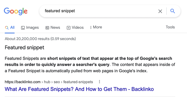 Featured snippets are small excerpts from the web page that appear on the main Google SERPs. Google uses featured snippets to provide relevant information to searchers as quickly and efficiently as possible.