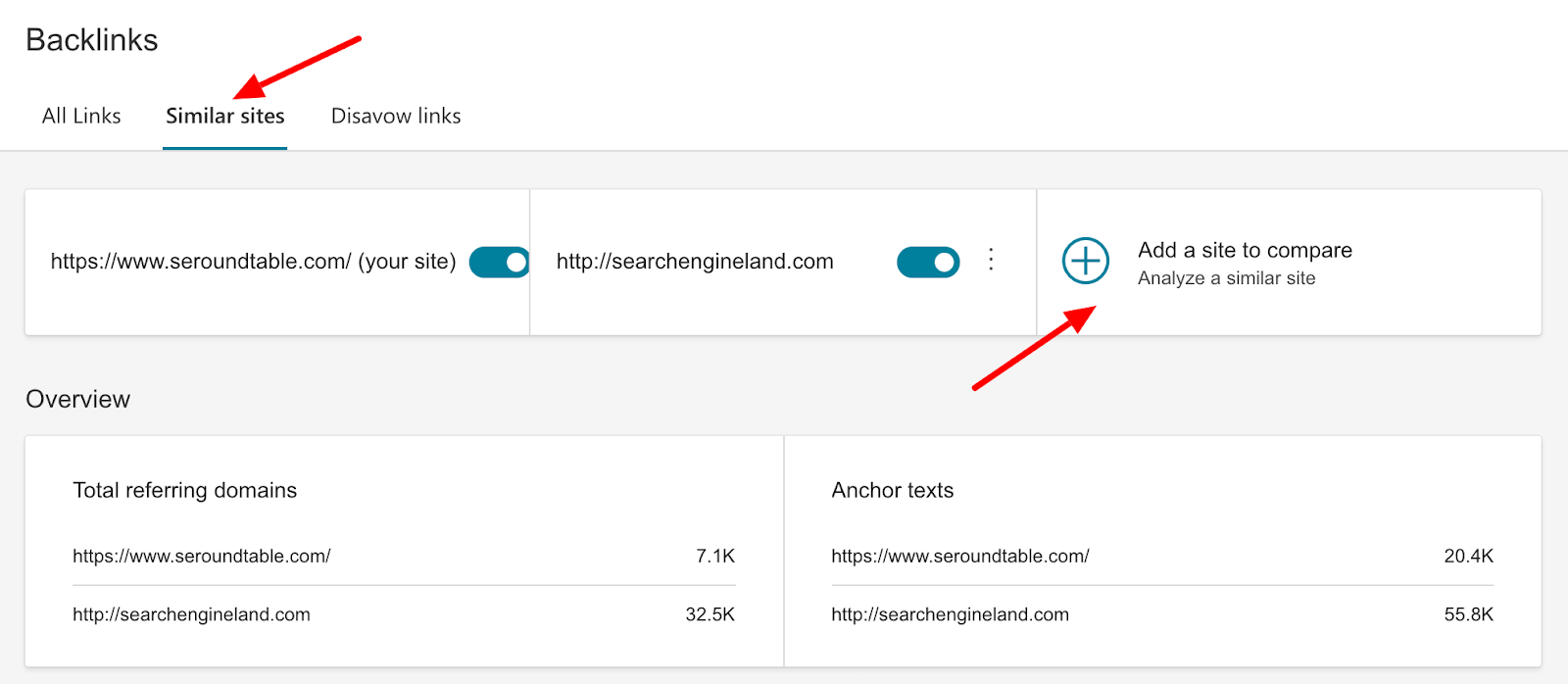 You’ll notice that there is now a second tab that says ‘Similar Sites’ — where you’d be able to add competitor websites for backlink comparisons and competitor data.