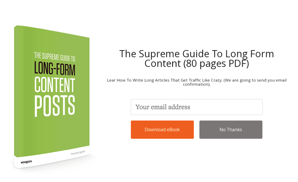 In this image, it may look like a full-fledged landing page. However, when someone visits the homepage of your blog, they are “welcomed” by the welcome mat. If they decide against the offer, they have the option (unlike a landing page) to scroll down and start reading your blog as they normally do.