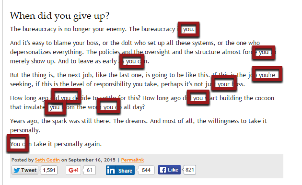 For instance, here is an example of one of Seth Godin’s blog post. Take a look at see how many times he has successfully addressed his readers by using the word “you”.